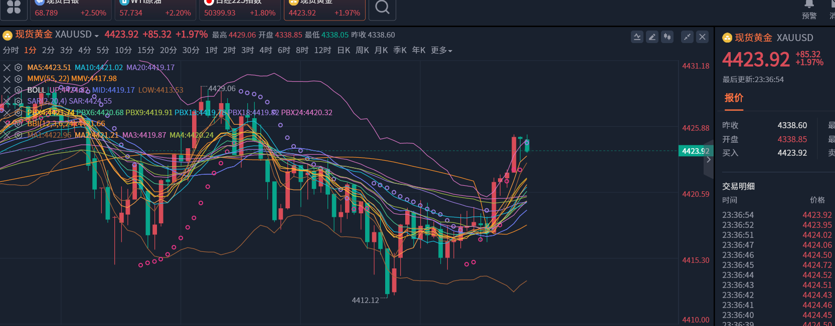 周一黄金开盘日内延续单边上行态势,截至当前持稳于4400美元上方,日线级别呈现连阳突破形态,多头动能强劲。从4小时图来看,价格沿布林带上轨持续攀升,MACD指标在零轴上方维持金叉,柱状线持续放大,确认中长期上升动量完好,但KDJ指标进入超买区域,短期存在技术性回调需求 。需注意的是,金价突破历史新高后,部分投资者存在获利了结意愿,分时图K线偶带短上影线,显示高位存在轻微抛压,暂不建议盲目追高,回调后介入性价比更高。技术面短期支撑关注4380-4370美元区间,此位置既是日内涨幅的回调修正位,也临近近期上行趋势线,具备较强支撑力度;重点防守4350美元一线,该位置对应前期震荡平台上沿,若失守可能引发阶段性回调。上方阻力4430-4450美元区间。整体来看,金价仍运行于强劲上行通道中,布林带带宽扩张显示趋势动能充足,KDJ超买未现死叉说明多头趋势未改,震荡整固后延续冲高概率较大