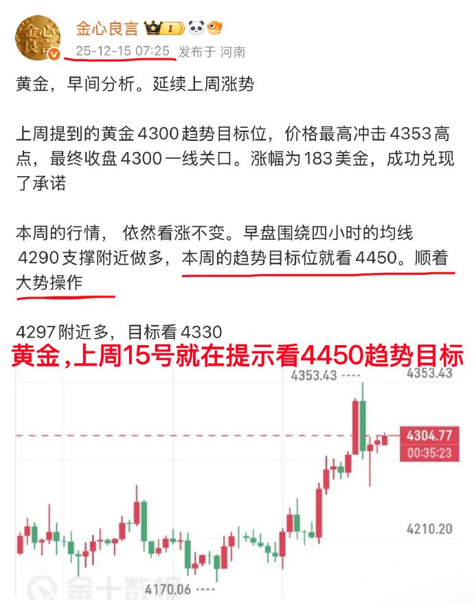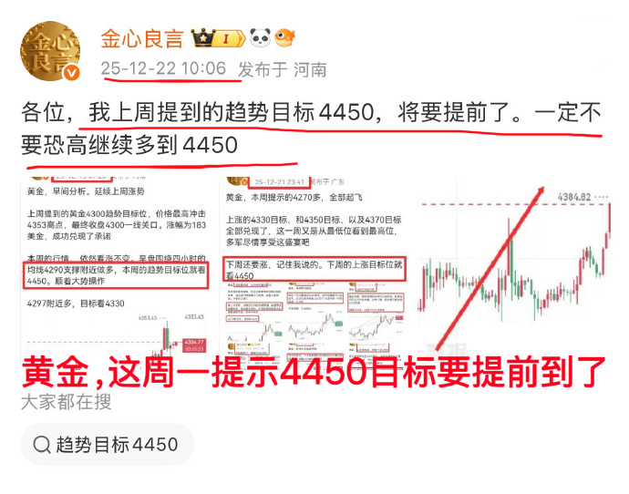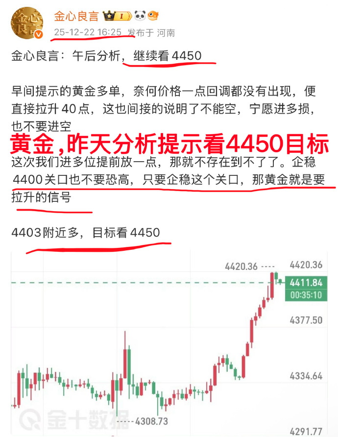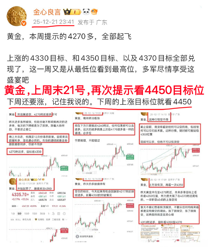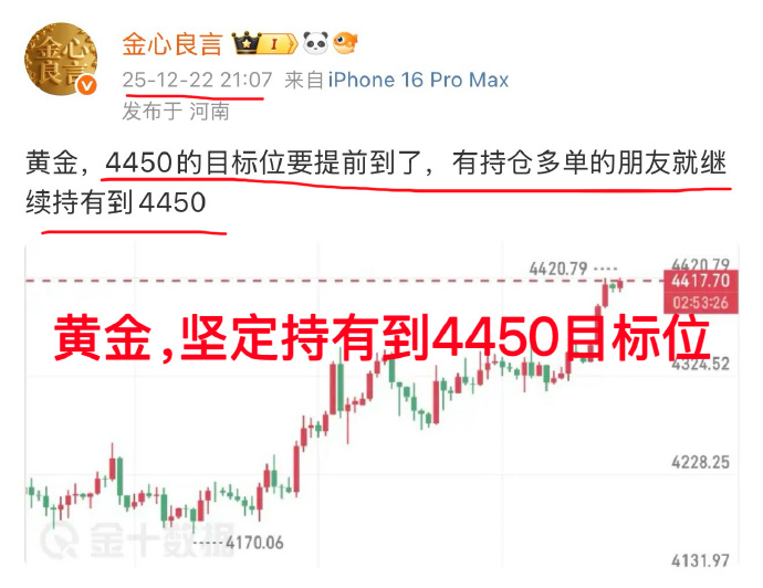 在上周一15号就提示布局4450了,中间也都是多次提醒看到这个目标位置。本周一也说了,这个位置会提前来到的,现在4450成功拿下