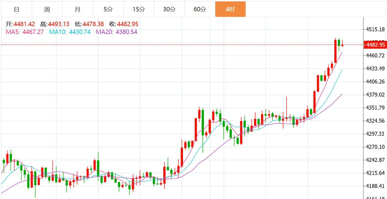 结合黄金一小时图,小时线连阳走高只能说走势极强,而早盘直接上涨根本不给你上车的机会,今天下方回撤低点也是开盘位4448一线,多头的下一阶段上行目标,是推动价格有效收于4500美元这一关键技术阻力位上方。若该关口被成功突破并站稳,金价有望进一步打开上行空间。目前市场并没有明确的基本面方向引导,行情却疯狂的上涨,主要还是市场极端炒作情绪作祟,如此走势看似强势但也是爱莫能助,潜藏的风险不好预判,只能是看行情给不给上车机会了!今日操作建议:行情给机会的话给待回撤4450附近做多,防守4435,目标看向4500!行情不给机会或保守者可直接仅观望不参与,晚间或待根据美GDP数据的影响,在有据可依的情况下看能否进行一波短线的参与,到时实盘再给出策略调整!综合来看,黄金今日短线操作思路上贺博生建议以回调做多为主,反弹高空为辅,上方短期重点关注4500-4520一线阻力,下方短期重点关注4460-4440一线支撑。