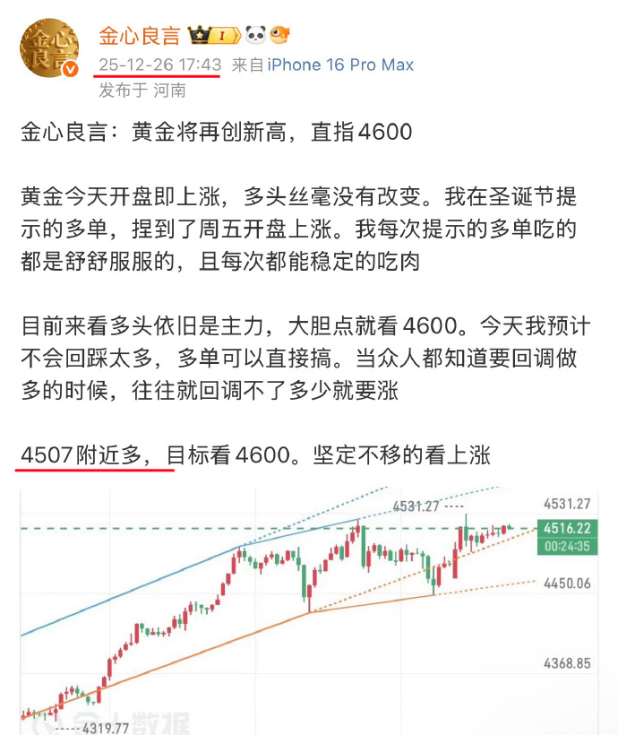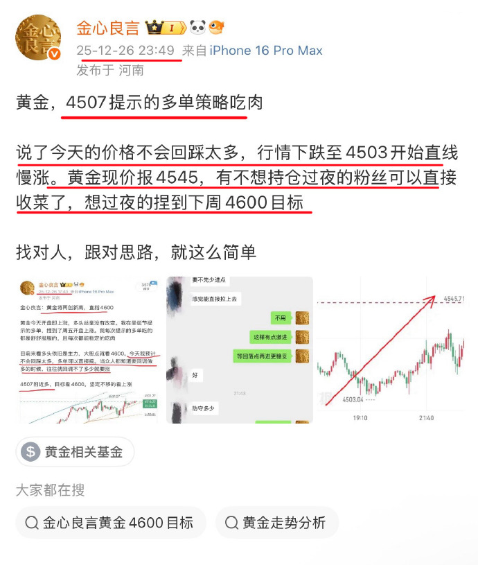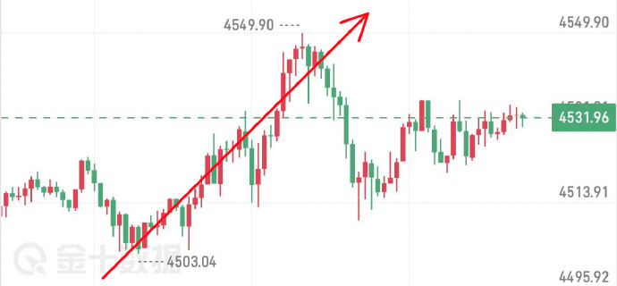 黄金,本周周五的策略思路接近晚饭的时间点,我在4507位置提示做多。随后黄金先是回踩至4503附近开始直线上涨了,最高点的位置涨到了4550附近同时提示不想过夜的粉丝可以在4545离场,想继续持仓的粉丝可以继续看到4600