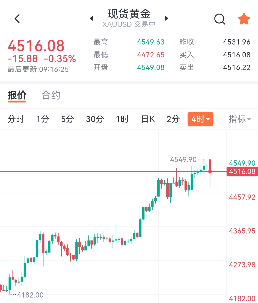 黄金紧跟白银步伐,持续刷新历史新高,上周五最高触及4550一线,尾盘强势收尾,涨势延续性拉满。