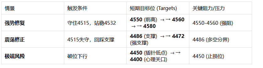 如果周一开盘多头资金回流,且价格站稳4515美元上方,上方有三个清晰的阻力台阶: