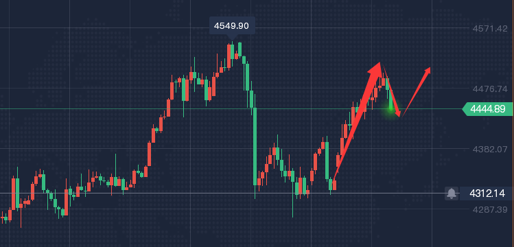 四小时周期已经形成了单边均线上涨的状态,5,10日均线的支撑非常明显,今天下方的支撑在4475,4460,这两个点位不破依旧可以顺势做多,特别是4460是连续上涨后的强弱关键点,这个点位不破可以坚决做多,看涨逐步看到4520,4550。当然如果今天意外破位4460,也有可能像山海讲过的一样,周三回出现调整空间,到时候再看调整空间的大小。