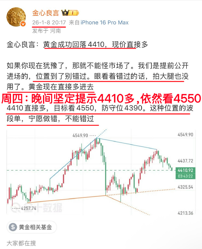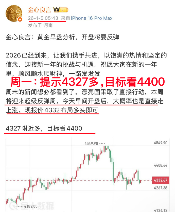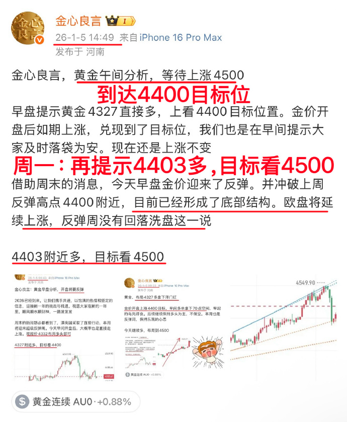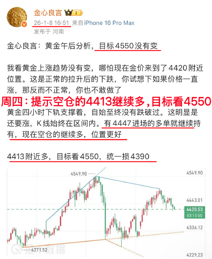 4327的多单,4400目标已到达。4403的多单,4500目标已到达。两次的多单,涨幅都是将近百点空间。共计拿下了170点空间其余的4447、4413、4410多单,我还要捏到4550目标位置,这就是本周的总结。一路都在提示多,金价下跌后我依旧坚定进多金心良言:下周还会涨,继续先看4550目标