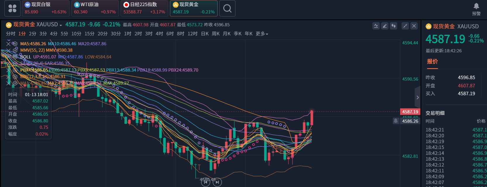 1.今日早间行情表现:今日早间黄金高开于4604,开盘后走高至4607一线,随后遭遇崩盘跌至4578,之后震荡回升重返4599附近。从当前走势来看,早间行情呈现宽幅震荡格局,多空博弈较为激烈。