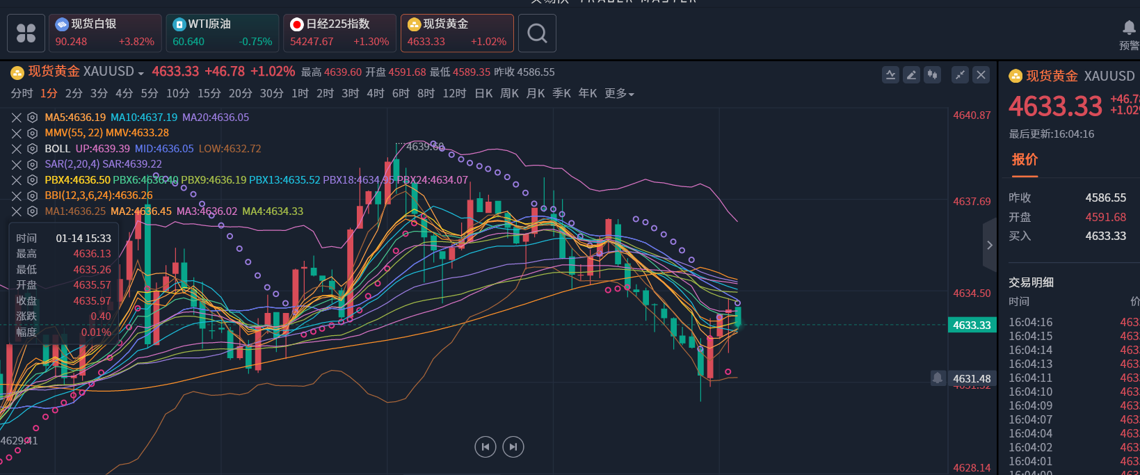 今日早间开盘后继续上行,目前小时线也将有可能围绕于大区间的震荡横盘趋势,短线内从各个指标而言,短期内多空力量比较平衡,也或许是为下一步的上涨继续能量,技术面上,日线级别仍然处于多头排列,均线系统完好,而4小时线目前也是处于第五浪运行的末端,短期内有可能存在调整的风险,而下方的重点支撑还是围绕于昨日的低点4570一线位置,此位置也将有可能是近期内的多空分水岭,而一旦下破的话,将会有更深的回调,而上方的重点压力则维持于4640附近,短线内大幅度突破的可能性并不大,再者昨日CPI数据公布,可能会降低了降息预期的变化,则日内我们还是先尝试性做空等待。