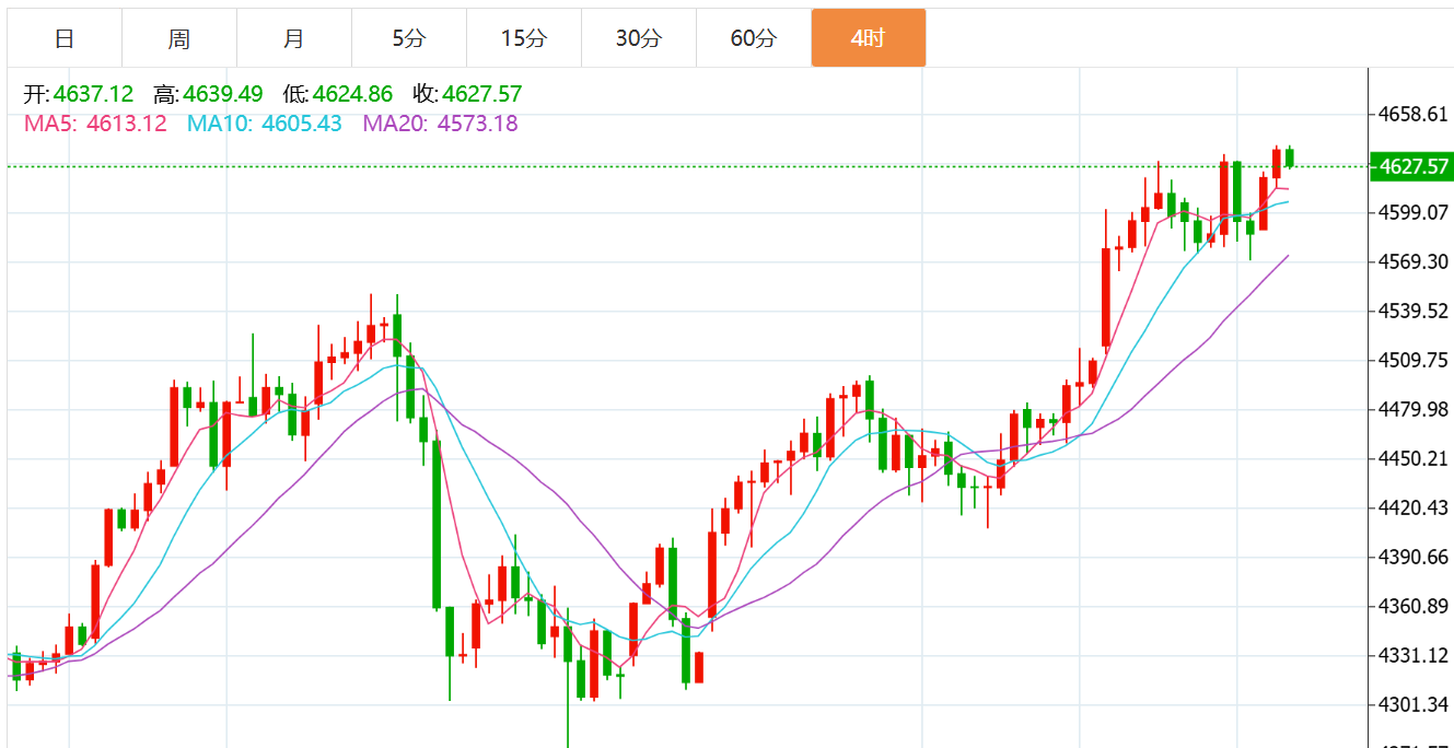 今日早间开盘后继续上行,目前小时线也将有可能围绕于大区间的震荡横盘趋势,短线内从各个指标而言,短期内多空力量比较平衡,也或许是为下一步的上涨继续能量,技术面上,日线级别仍然处于多头排列,均线系统完好,而4小时线目前也是处于第五浪运行的末端,短期内有可能存在调整的风险,而下方的重点支撑还是围绕于昨日的低点4570一线位置,此位置也将有可能是近期内的多空分水岭,而一旦下破的话,将会有更深的回调,而上方的重点压力则维持于4640附近,短线内大幅度突破的可能性并不大,再者昨日CPI数据公布,可能会降低了降息预期的变化,则日内我们还是先尝试性做空等待。综合来看,黄金今日短线操作思路上贺博生建议以回调做多为主,反弹高空为辅,上方短期重点关注4650-4670一线阻力,下方短期重点关注4610-4590一线支撑。