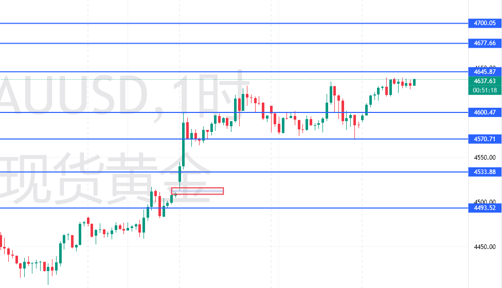 4641-4645的关键节点是多空双方激烈争夺的“可上可下” 的关键节点 。如果金价能够有效突破并站稳在该位置之上 ,则意味着上涨空间被进—步打开 ,有望挑战更高的目标 。反之, 如果在此位置受阻回落 ,则可能引发—轮技术性调整。