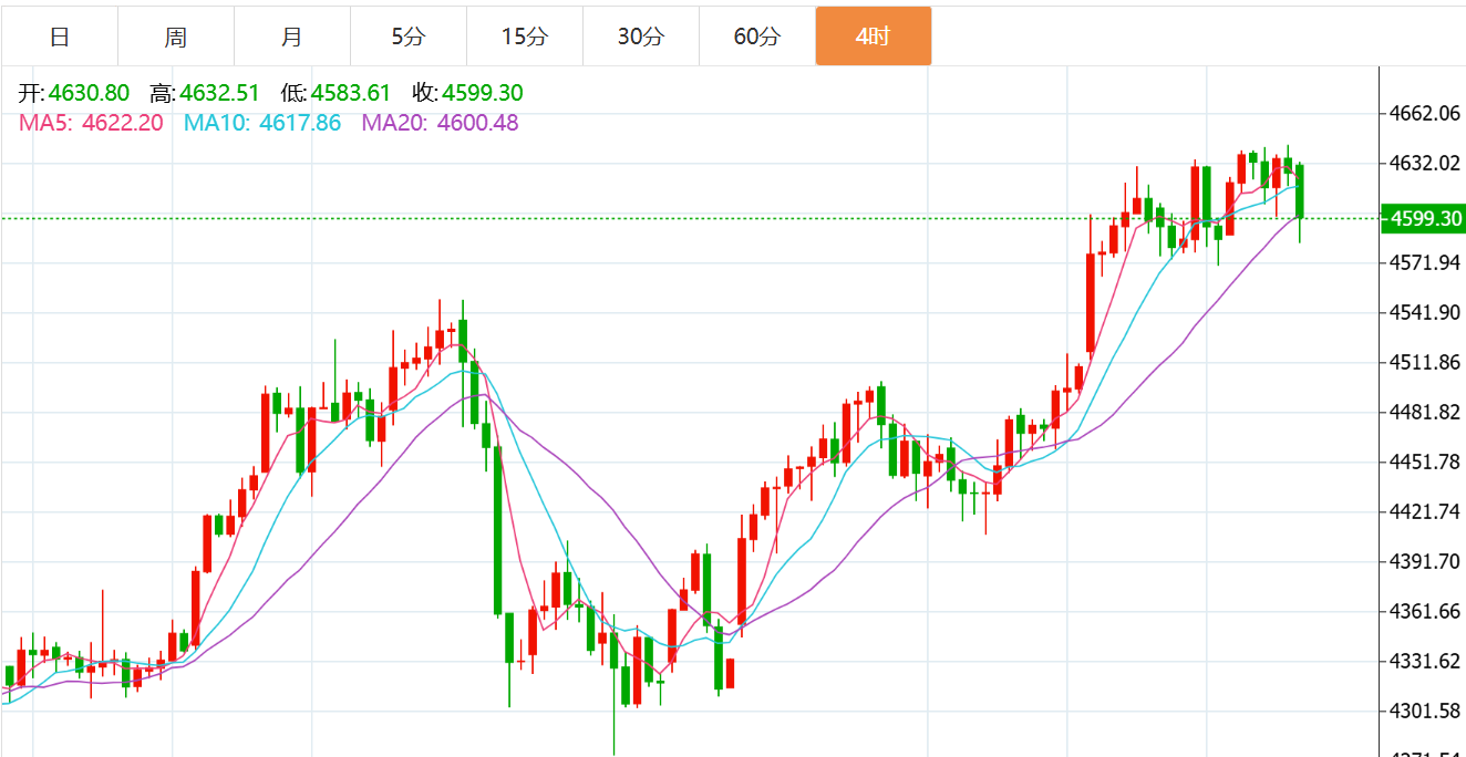 黄金技术面分析:当前盘面来看,黄金日线级别,周一大阳突破站上前历史新高4550,昨日收报小阴,属于回踩修正,今日再度拉升走高;从目前走势看,趋势多头依旧很强,只要5日均线未有效失守,将维持短期逼空上拉,而黄金近期的走势轨迹是一波连阳拉升 横盘 连阳拉升,中途偶尔出现大阴的短暂修正,所以若看今日形态,若冲高回落收报长上影线K,则它开始高位横盘;若收报不错的饱满阳K,那么继续单边上拉;短期通道上轨阻力今日对应是4640一线,5均线支撑上移4555一线。黄金4小时级别,短期5日仍金叉10日,处于高位强势运行,不过macd有所滞涨,需回调一波才能更好的上拉;中轨支撑上移4571上,此位置继续保持看北,当前高位谨慎追北,容易冲高回落。