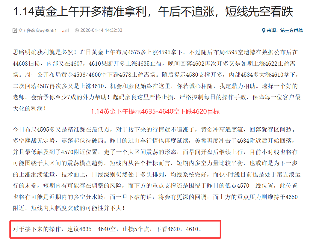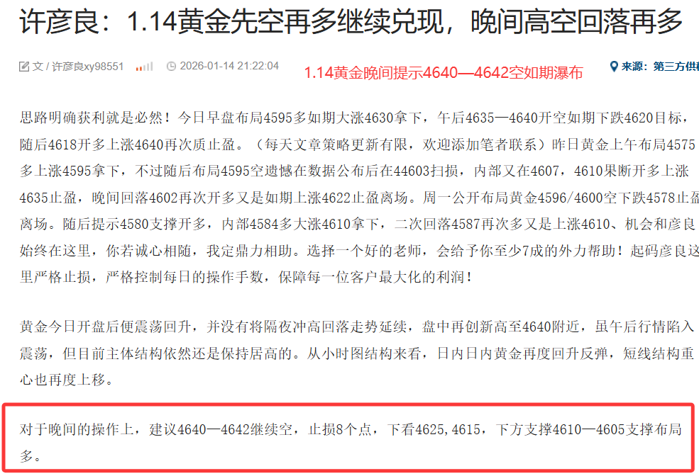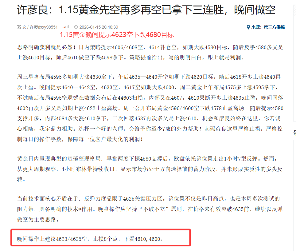 思路明确获利就是必然!一公开布局黄金4596/4600空下跌4578止盈离场。随后提示4580支撑开多,内部4584多大涨4610拿下,二次回落4587再次多又是上涨4610,周三早盘布局4595多如期大涨4630拿下,午后4635—4640开空如期下跌4620目标,随后4618开多上涨4640再次止盈。晚间提示4640—4642空,4633空,4617空如期大跌4600,周三早盘布局4595多如期大涨4630拿下,午后4635—4640开空如期下跌4620目标,随后4618开多上涨4640再次止盈。晚间提示4640—4642空,4633空,4617空如期大跌4600,周四策略提示4606/4608空,4614补仓空,如期大跌4580目标,随后反手4580多又是上涨4610目标,随后4610做空下跌4598拿下。晚间反弹4623再次开空又是如期瀑布大跌4680一线,周五早盘提示4607/4609空如期下跌4590拿下,下午策略提示4515开空又是如期大跌4580一线目标,晚间提示4610/4612空直接瀑布下得4536。策略提前给出,写的明明白白,跟上就是利润。机会会和彦良始终在这里,你若诚心相随,我定鼎力相助。选择一个好的老师,会给予你至少7成的外力帮助!起码彦良这里严格止损,严格控制每日的操作手数,保障每一位客户最大化的利润!