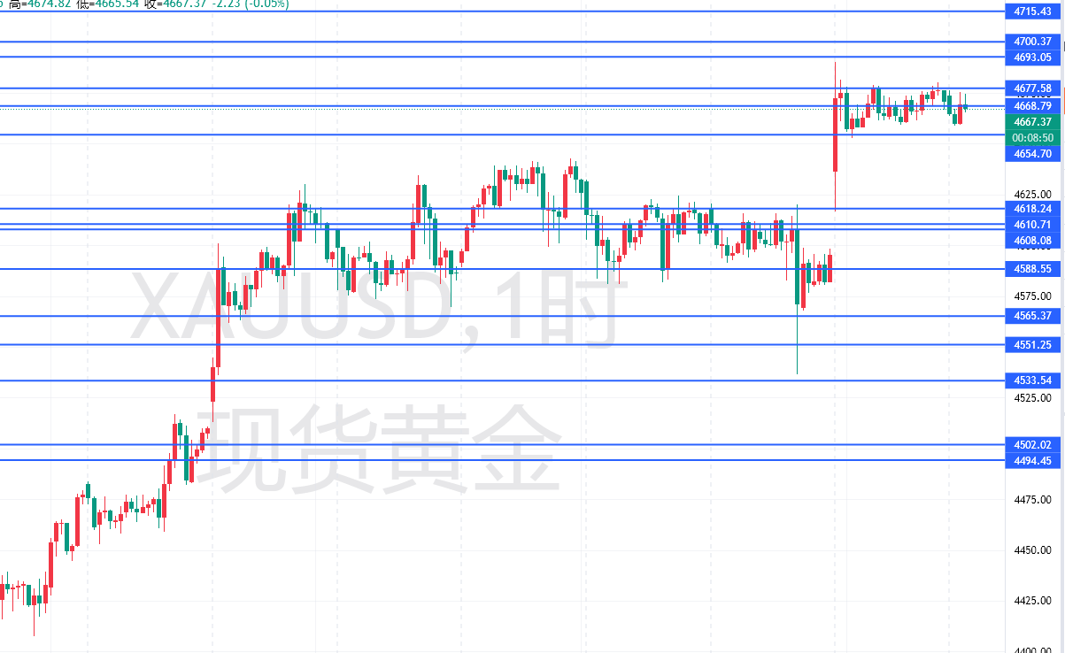 昨日跳空高开黄金升到历史新高4690、而后来到4677-4655的高位震荡。我们首先来看一下后续的关键支撑压力。