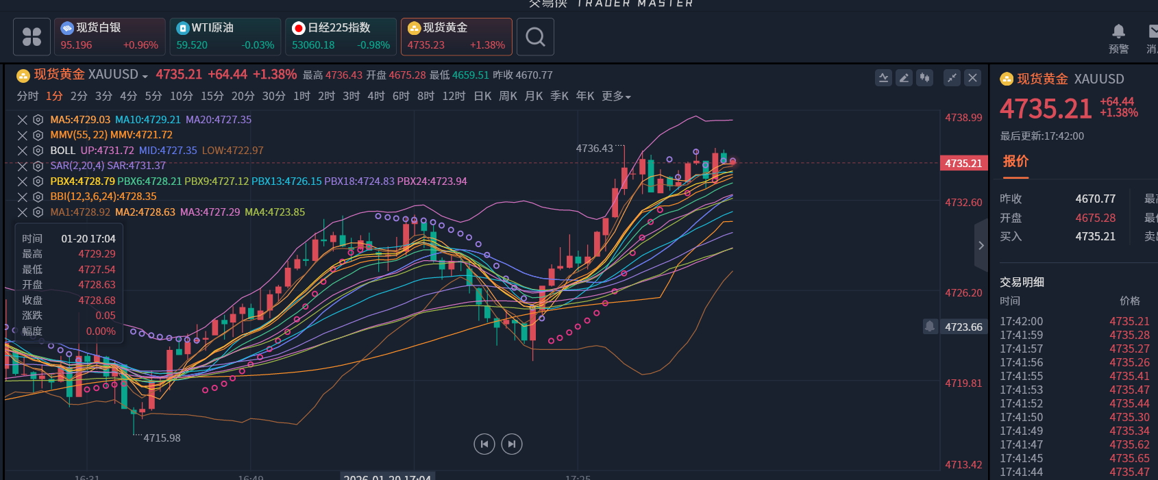 黄金今日最低4659,截止到17点时分最高触及4736一线目前还有继续上行的动能,那么今天的高点我们就看4750区域突破看4800,早盘强势,如果欧盘不回头,那么美盘继续以回撤多为主。每次的周一都是高开的迹象还是比较显著的。目前高点已经没有技术指标来作为支撑了,完全就是无厘头的强势上涨技术指标已经显得苍白无力。2026年黄金预计会上冲5000大关我们拭目以待。