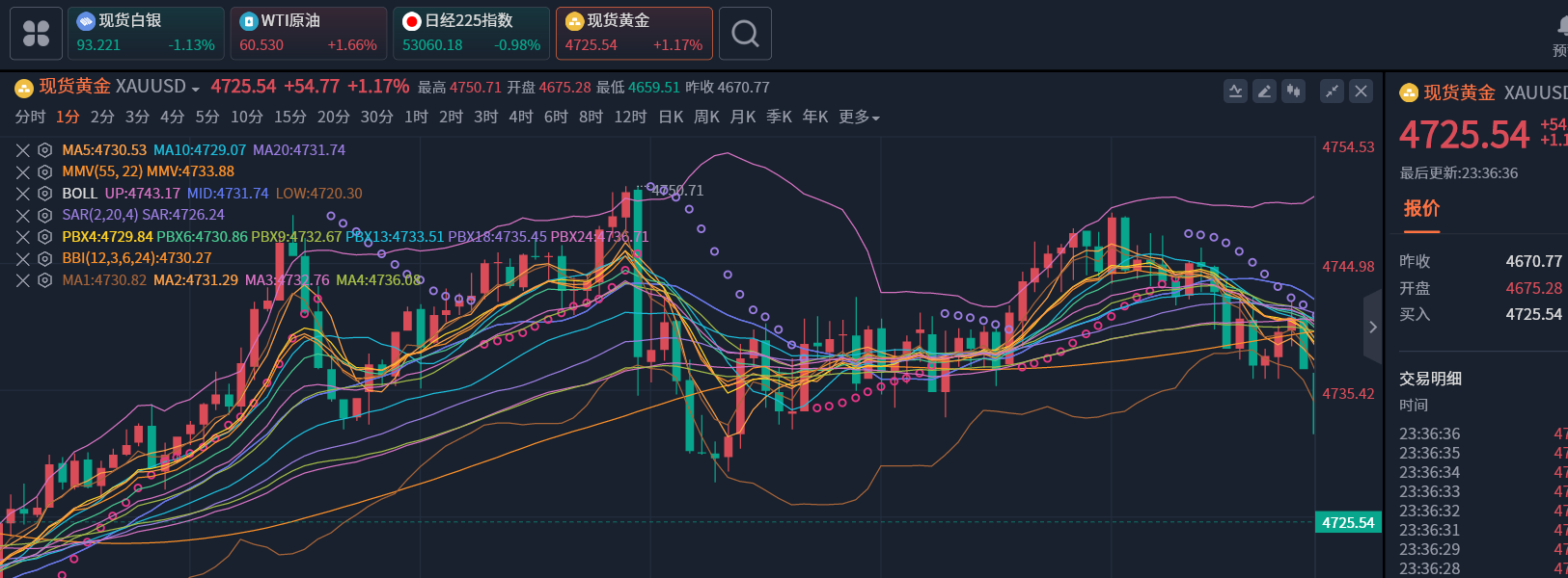 黄金今日最低4659,截止到23点时分最高触及4750一线后回撤,那么今天的高点我们就看4760区域突破看4800,早盘强势,如果欧盘不回头,那么美盘继续以回撤多为主。每次的周一都是高开的迹象还是比较显著的。目前高点已经没有技术指标来作为支撑了,完全就是无厘头的强势上涨技术指标已经显得苍白无力。2026年黄金预计会上冲5000大关我们拭目以待。