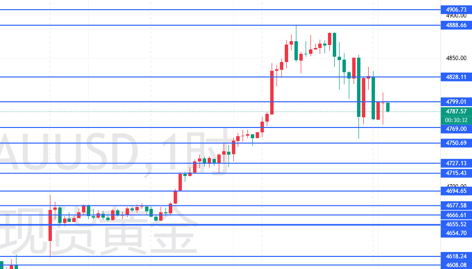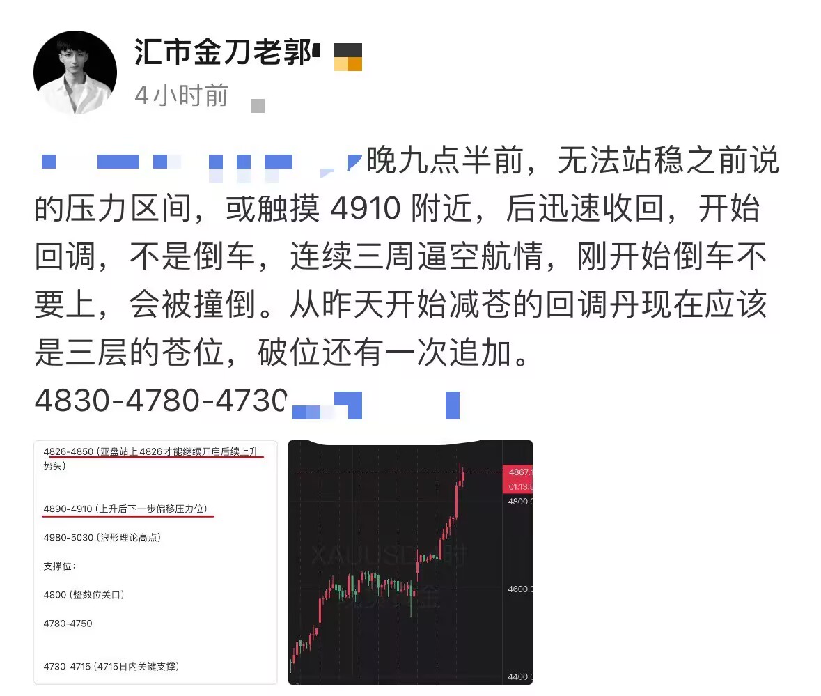昨日预测完美验证:昨日我明确提示"金价无法站稳4888-4910压力位,后迅速收回,开始回调,不是倒车,连续三周逼空行情,刚开始倒车不要上,会被撞倒"。预判已被市场完美验证。川普达沃斯讲话后迅速回落至48300附近美盘时段虽有小幅反弹,但始终未能突破4830关键阻力,后续凌晨继续回调至最低4750。