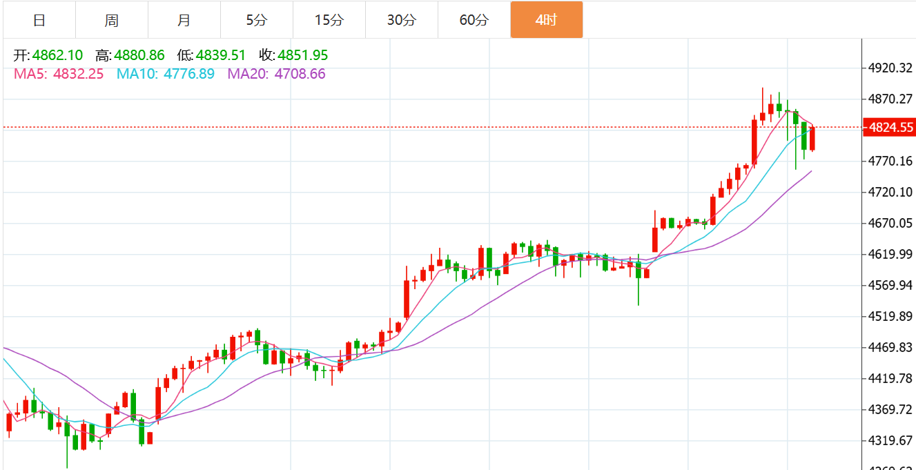 黄金技术面分析:黄金经过三天上涨,最高在4890附近,接近4900高点,前面讲过,黄金在这个周期中的上涨是由于市场刺激的原因,但一旦消息面消退,黄金就会走出暴跌的风险,所以,在周三午夜黄金出现了接近150美金的下跌,并且这波下跌还在持续,那么基本符合张德盛的预期,这波向下的时间点在周三或者周四。既然周三走出了下跌,那么,周四回延续走出下跌的力度,今天深跌一波的话就可以看到本周起涨点4650或者周初的调高窗口4600。按照技术面来看,日线周期的大跌即将开始,日线已经形成了顶点的形态,目前需要跌破5,10日均线的才能确定1月的大跌,所以,暂时还是多头趋势,只不过是调整,日线的支撑点在4730,4650,其中4650是这波强势的关键点。H4周期已经收口了,特别是午夜的下跌直接破位5,10日均线的支撑,现在需要看跌破布林中轨4730,然后再看去4600甚至更低,所以在这个时间节点上,周四要关注黄金的调整空间,下方的预期以及给出了,上的需要注意4835,4855两个*点。综合来看,黄金今日短线操作思路上贺博生建议以回踩低多为主,反弹高空为辅,上方短期重点关注4855-4875一线阻力,下方短期重点关注4800-4770一线支撑。