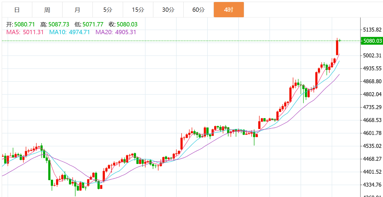 黄金技术面分析:黄金上周五日间如期冲高至4966一线,再度刷新历史纪录,随后欧盘展开技术性回调至4900附近。此走势完全符合创新高后的常规市场行为——多头部分获利了结引发回踩,但整体结构仍稳固运行于大趋势多头格局之中。技术层面传递出清晰信号:1小时布林带收口,显示短期动能进入整理;4小时级别趋势完好,但急需一次健康的回调来修复超买指标并巩固升势基础。不用看都是多头走势,全部都是大阳线起飞,底部呈现圆弧底的形态,k线始终站稳均线,始终踩着均线上行,能够从4900附近拉升到5000点,多头的强势不用说了,本周回落继续多。黄金周一开盘,现货黄金冲上5020美元大关,目前最高上涨5093一线,白银一度冲上106美元。技术层面的信号同样清晰指向多头。多头动能仍在持续释放;布林带呈现明显的向上开口形态,价格始终沿着上轨附近运行,上涨通道保持完好,趋势延续性极强。四小时级别来看,黄金在高位进行震荡蓄势,布林带开口进一步扩张短线仍具备充足的上攻动能。综合来看,黄金今日短线操作思路上贺博生建议回调做多为主,反弹做空为辅,上方短期重点关注5110-5130一线阻力,下方短期重点关注5050-5030一线支撑。