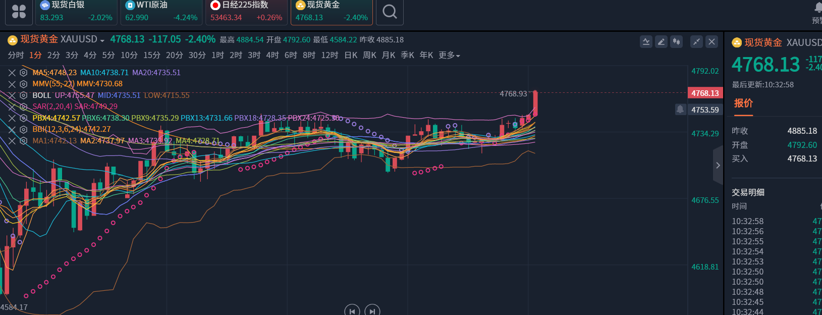 周一(北京时间2月2日)亚市早盘,现货黄金交投于4770美元/盎司附近,早间开盘一度逼近4700美元/盎司关口,有望下探测试4500美元/盎司关口。