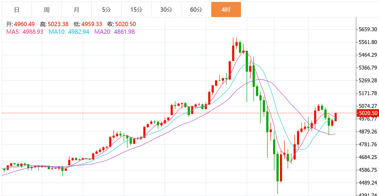 以小时图结构来看,昨日黄金重返20小时均线上方后,行情持续的居于其上震荡,昨晚行情有回撤也并未跌破20小时均线,今日行情早盘再度拉升,随后行情居高震荡,欧盘时段的回撤也未破20小时均线,两日走势节奏极为类似,所以晚间着重要关注目前20小时均线5015附近的争夺,如果此位失守,那么黄金的短线级别超跌反弹趋势或将结束,至此也将重归弱势调整趋势。而若今晚5015-00守得住,那么黄金很有可能会继续居高震荡,但是上方5100依然有*作用,且这样的状态潜藏的变数风险大,对于操作上也并不有益。对于黄金压力短期5100关口,然后5135-45区域和5220-40区域是重点,这就是报复性反弹的目标区域,也是接下来可能的二次下跌空头回补的起始点。支撑短期4880-70(日内多空转折点),然后4700-20和4600,极限依然是元旦期间低点,当然4500和周一低点4400美元是关键,因为假如再去4400,元旦低点估计也要测试。综合来看,黄金今日短线操作思路上贺博生建议以回踩低多为主,反弹高空为辅,上方短期重点关注5070-5120一线阻力,下方短期重点关注4970-4920一线支撑。