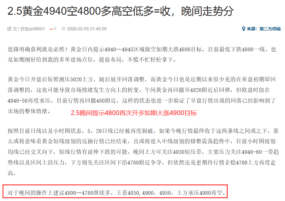 思路明确获利就是必然!黄金周四提示4940—4945区域做空如期大跌4880目标,目前最低下跌4800一线,也是如期刚好给到我的多单进场点位,上涨4870一线,提示回落4800继续开多也是再次给到我们进场位置,大涨4900目标再次拿下。提前布局,不慌不忙轻松拿下。