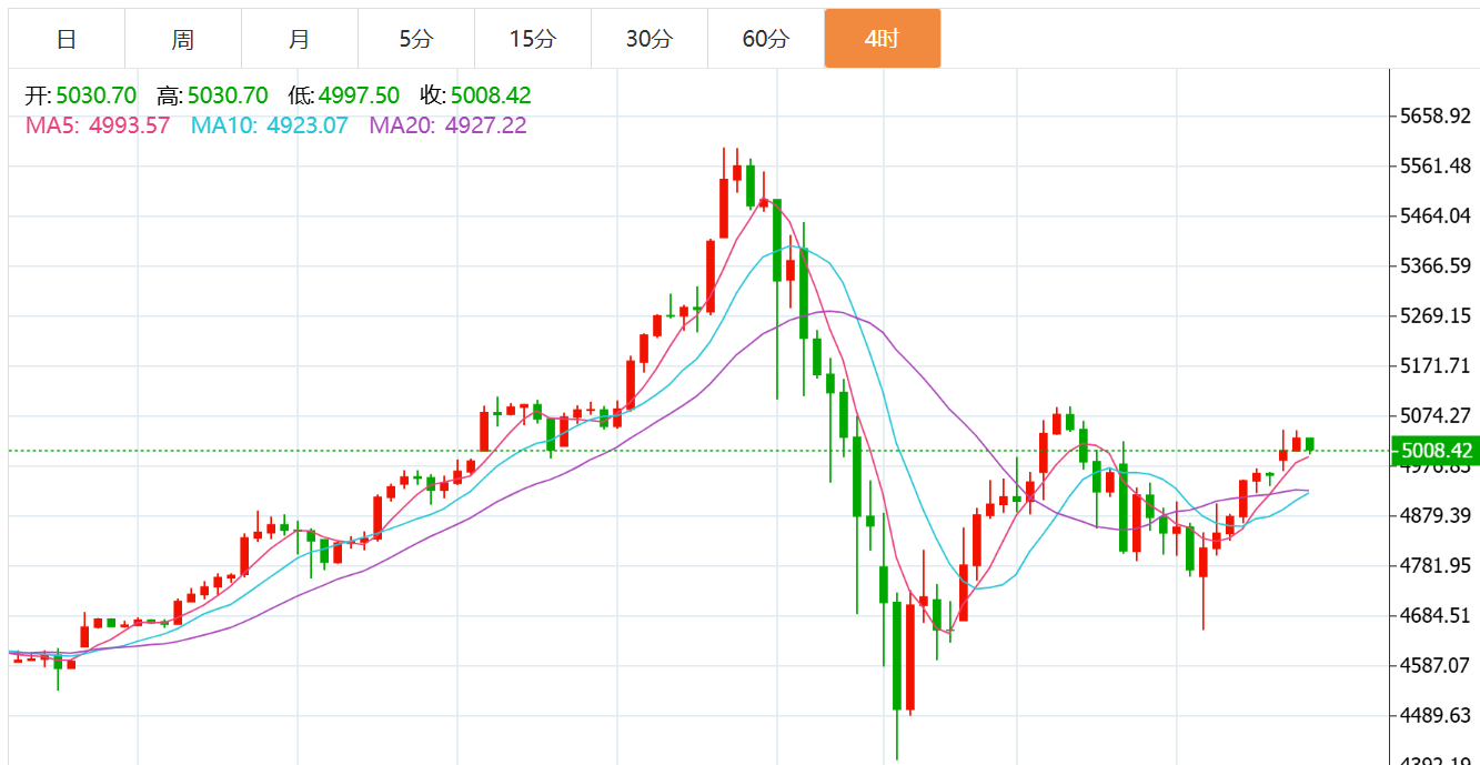 黄金技术面分析:早盘黄金高开,最高在5045附近,进一步的扩大了上周4700布局的多单利润,跟上周提示的在4400支撑布局多单一样,本周也需要关注5100是否破位,上周讲过,5100之下,黄金会是弱势震荡,有来回往返的可能性,但一旦站稳5100.黄金的多头趋势开启,上涨就相待轻松,可以继续看5350.5600.从技术面来看,日线的上涨趋势比较明显,在第二波初级4650后黄金大涨,日线收阳,破位布林中轨,那么接下来,日线在本周连阳后会破位5100.那么,再看日线上轨目标5350.至于是否能破位5600则需要看本周众多数据的刺激。虽然坚决看涨,但也不能掉以轻心,因为暂时黄金没有破位5100.也没有形成H4布林上轨的开口,所以周初也没有形成绝对的强势,也就是说存在随时回落的可能。小周期的周初下方关注4935附近,可以考虑回落后继续做多。周内的重点行情从周三开始关注数据刺激。综合来看,黄金今日短线操作思路上贺博生建议以回踩低多为主,反弹高空为辅,上方短期重点关注5050-5100一线阻力,下方短期重点关注4970-4950一线支撑。
