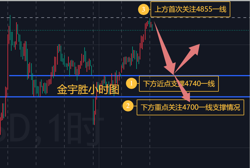 日内操作思路上,10 日均线支撑在 4740 附近,该区间为短线关键防守位。上方阻力重点关注:第一阻力位上周高点 4855-60附近,此位置为短期多空分水岭;若行情强势突破该位,说明上涨趋势未终结,需等待新顶部结构形成后再布局调整;若承压回落、无法有效突破,则行情有构成双顶形态、开启调整的可能。因此,今日操作需紧盯 4855-60附近突破情况,依托均线支撑低多,关键阻力位可轻仓尝试空单。