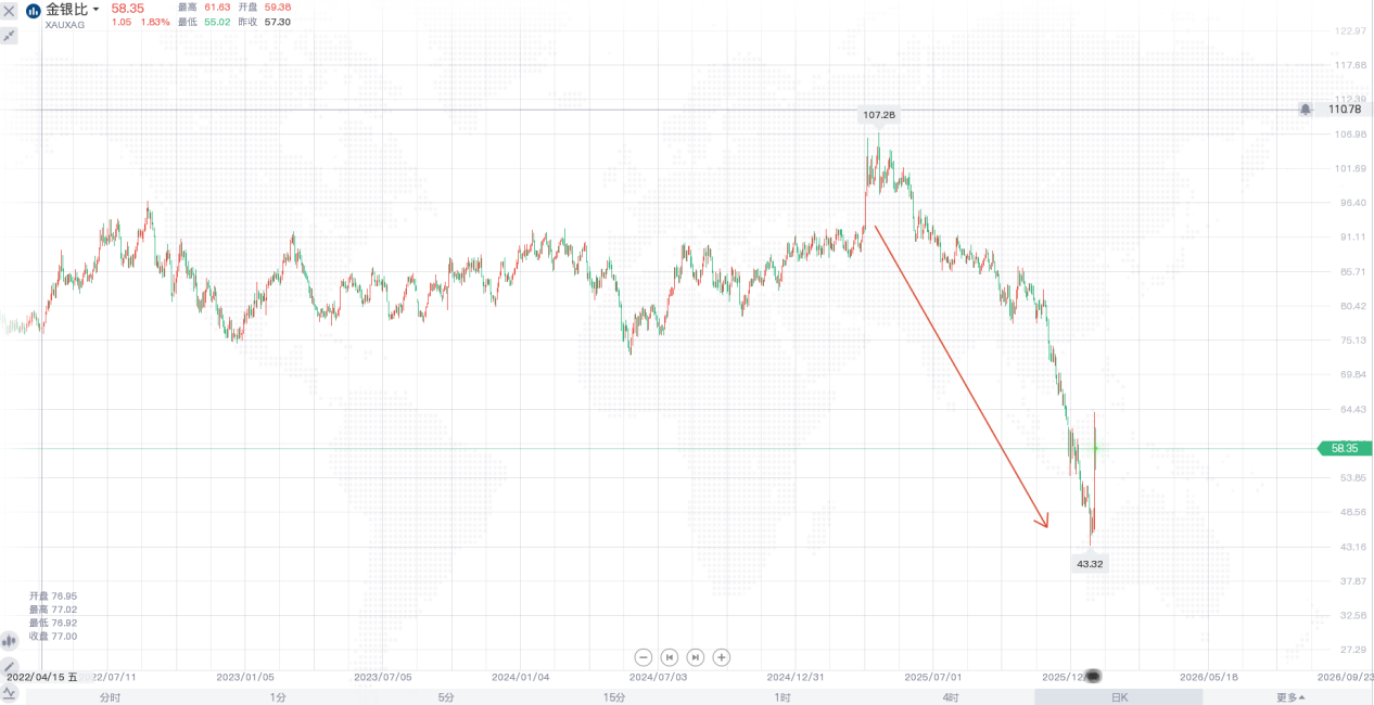 这事得从2025年4月说起,当时特朗普搞“关税解放日”,金银大跌,黄金和白银的价格比快到110了,后来就慢慢反弹,金银比最低都是43附近,直到最近两个月,被一个分析师的警告引爆了。