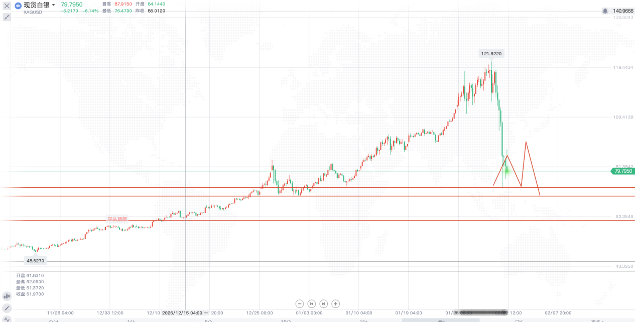 白银更夸张,盘中最大跌幅超36%,差点腰斩,后来稍微回升,也跌了26%左右。还有伦敦铜,也跟着跌了3.4%。但是铜的目标基本也到达了,还记得我在抖音2026年1月13日所给出的铜的目标吗,美铜看6.8,伦敦铜看14500,现在看来,基本也差不多了。