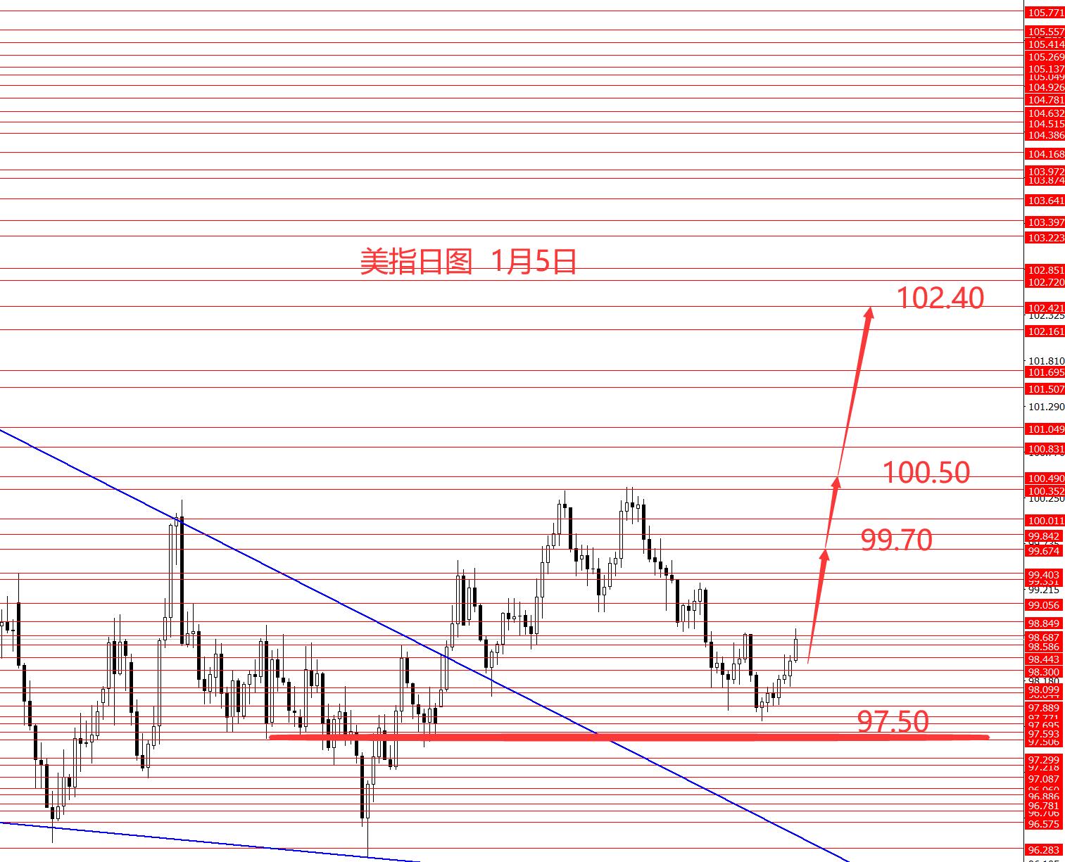 美指上周正如预期在97.50上方企稳上行,周图收阳柱。从图形来看,美指中线仍然看涨,本周关注下方98.10,以上继续看涨,日内关注下方98.40,以上继续看涨美指,中线看涨,也是长线中继修整行情。上周若持有多单,可继续持有。本周操作建议:98.40/50区域做多,止损98.10,目标看向99.70和100.50和102.40区域,控制仓量严格止损。