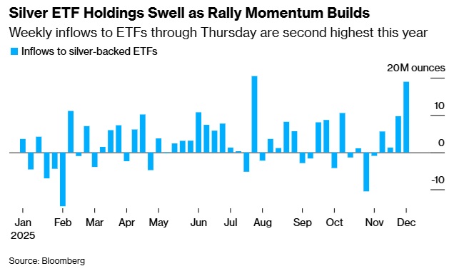 上周是自7月以来白银支持交易所交易基金(ETF)资金流入量最大的一周,新增近590吨,表明投资者认为这波涨势还有进一步发展的空间。