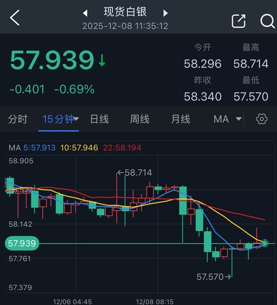 现货白银价格早盘一度升至58.71美元/盎司,逼近上周五创下的历史高位59.33美元/盎司。随后银价突然急跌至57.57美元/盎司,日内跌幅达到1.4%。