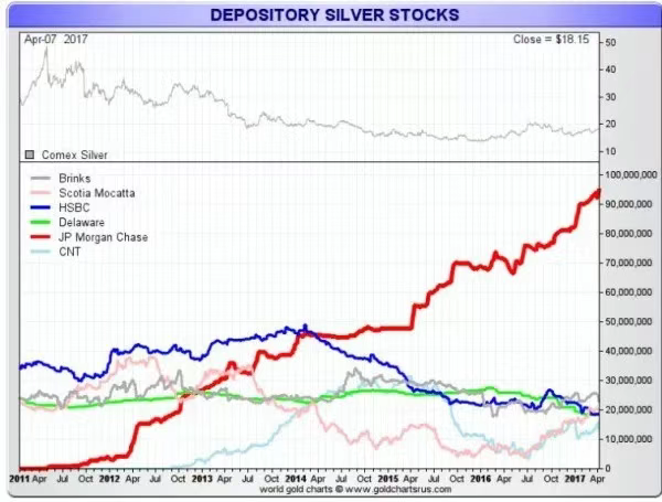 从 2011 年银价接近 50 美元的高点开始,摩根大通开始在其 COMEX 仓库中囤积白银,在其他大型机构减仓白银的时候,一路加持,最多占到了 COMEX 总白银库存的 50%。
