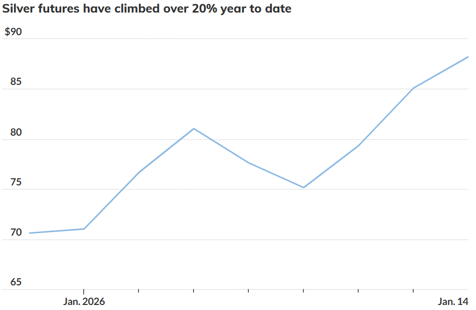 周三(1月14日)Comex 白银价格飙升至新高:最活跃合约盘中交易至91.44 美元,而该合约周二收于创纪录水平。年初至今,白银已上涨约 30%。黄金周三也有望再度刷新收盘纪录。