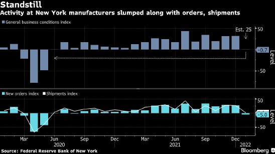 周二公布的数据显示,纽约联储制造业指数从一个月前的31.9大跌至-0.7。低于零表明经济活动萎缩,且该数据逊于接受彭博的所有经济学家预期。经济学家的预测中值为25.5。