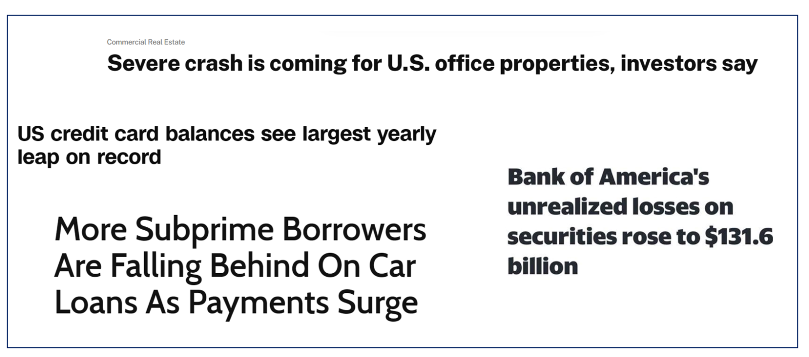金融压力的迹象太多了。其中包括美国银行债券投资组合的未实现损失(例如,美国银行的债券几乎相当于其一级资本)、次级汽车贷款违约和信用卡违约。当然还有所有与商业地产相关的风险。