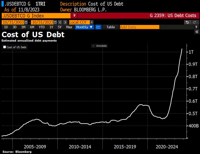 到2023年,美国的债务成本将超过每年1万亿美元。这比整个国防预算还要多。40%的个人税收用于支付债务利息。按照这个速度,这个数字可能在几年内达到100%。