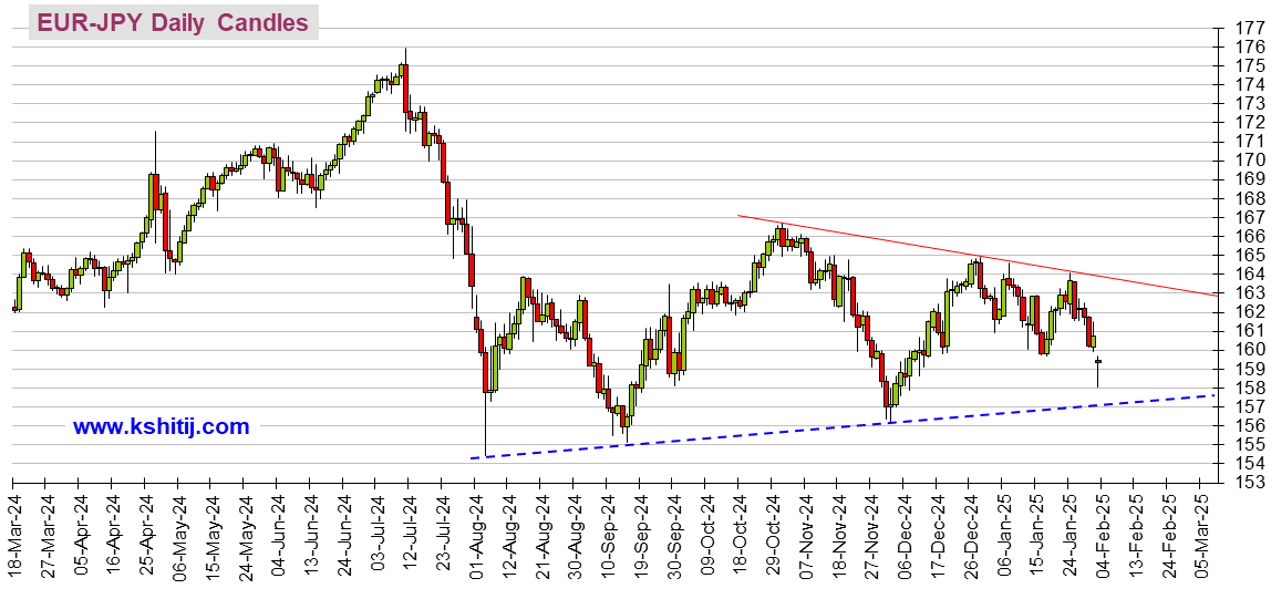 欧元/日元已经跌破160,如果下跌走势继续,短期内可能会延伸至157-156。