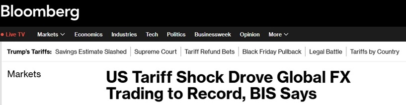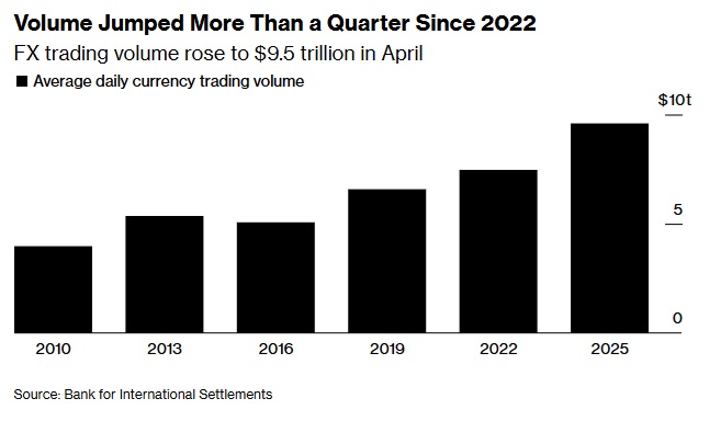 FX168财经报社(亚太)讯 美国彭博社报道称,根据国际清算银行(Bank for International Settlements),受美国总统特朗普(Donald Trump)的贸易关税政策扰乱市场的影响,今年全球外汇交易量飙升至历史新高,4月份日均成交量达9.5万亿美元。
