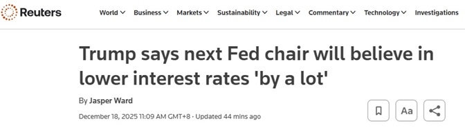 FX168财经报社(亚太)讯 美国总统特朗普(Donald Trump)当地时间周三(12月17日)表示,下一任美联储主席将是“非常”支持降息的人选。