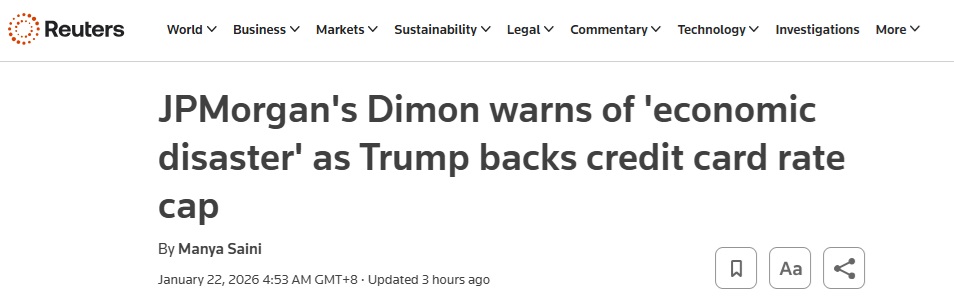 FX168财经报社(亚太)讯 摩根大通(JPMorgan Chase)首席执行官杰米·戴蒙(Jamie Dimon)周三(1月21日)警告称,一项拟对信用卡利率设定上限的提案将等同于一场经济灾难。与此同时,美国总统特朗普(Donald Trump)则加码支持这一想法,并表示他正要求国会批准该举措。