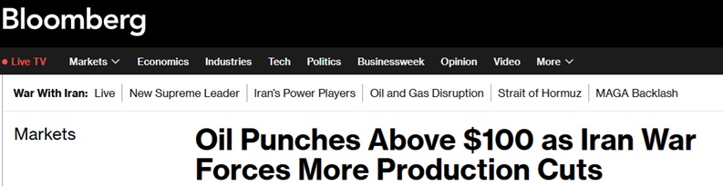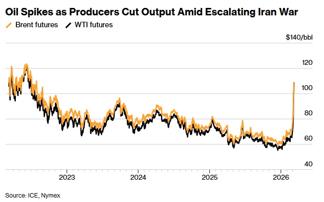 FX168财经报社(亚太)讯 周一(3月9日)亚洲市场开盘后,国际油价暴涨并突破100美元/桶,因为更多中东主要产油国开始削减产量,霍尔木兹海峡几乎完全关闭,而美国威胁将进一步加深这场已扰乱能源市场的冲突。美国总统特朗普警告称,空袭可持续到伊朗无领导人可投降。