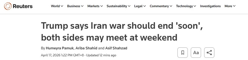 FX168财经报社(亚太)讯 英国路透社周五(4月17日)最新报道称,美国总统特朗普(Donald Trump)表示,他有信心很快能够达成协议以结束伊朗战争,并呼吁与德黑兰关系密切的真主党在黎巴嫩与以色列之间为期10天的停火生效期间保持克制。