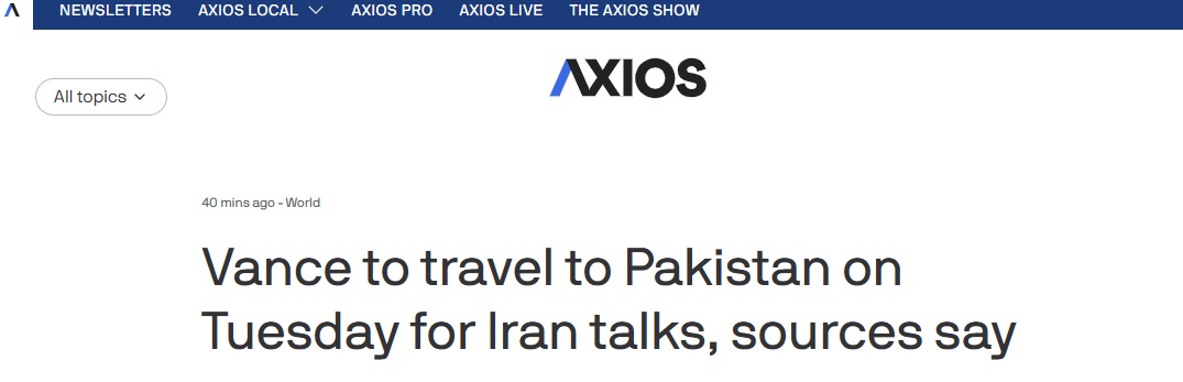 FX168财经报社(亚太)讯 美国新闻网站Axios当地时间周一(4月20日)晚间最新报道称,美国三位消息人士向Axios表示,美国副总统万斯(JD Vance)预计将于周二上午启程前往伊斯兰堡,与伊朗就一项可能结束战争的协议展开会谈。