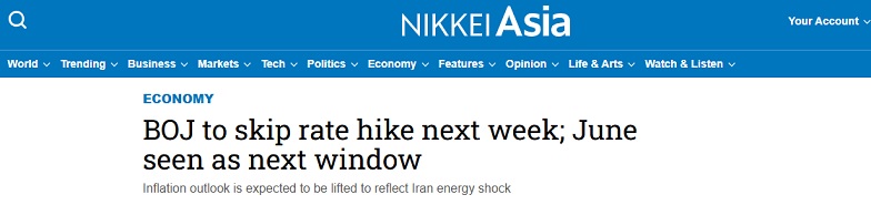 《日经亚洲》称,预计加息议题将推迟至下一次会议(6月15日至16日)讨论。